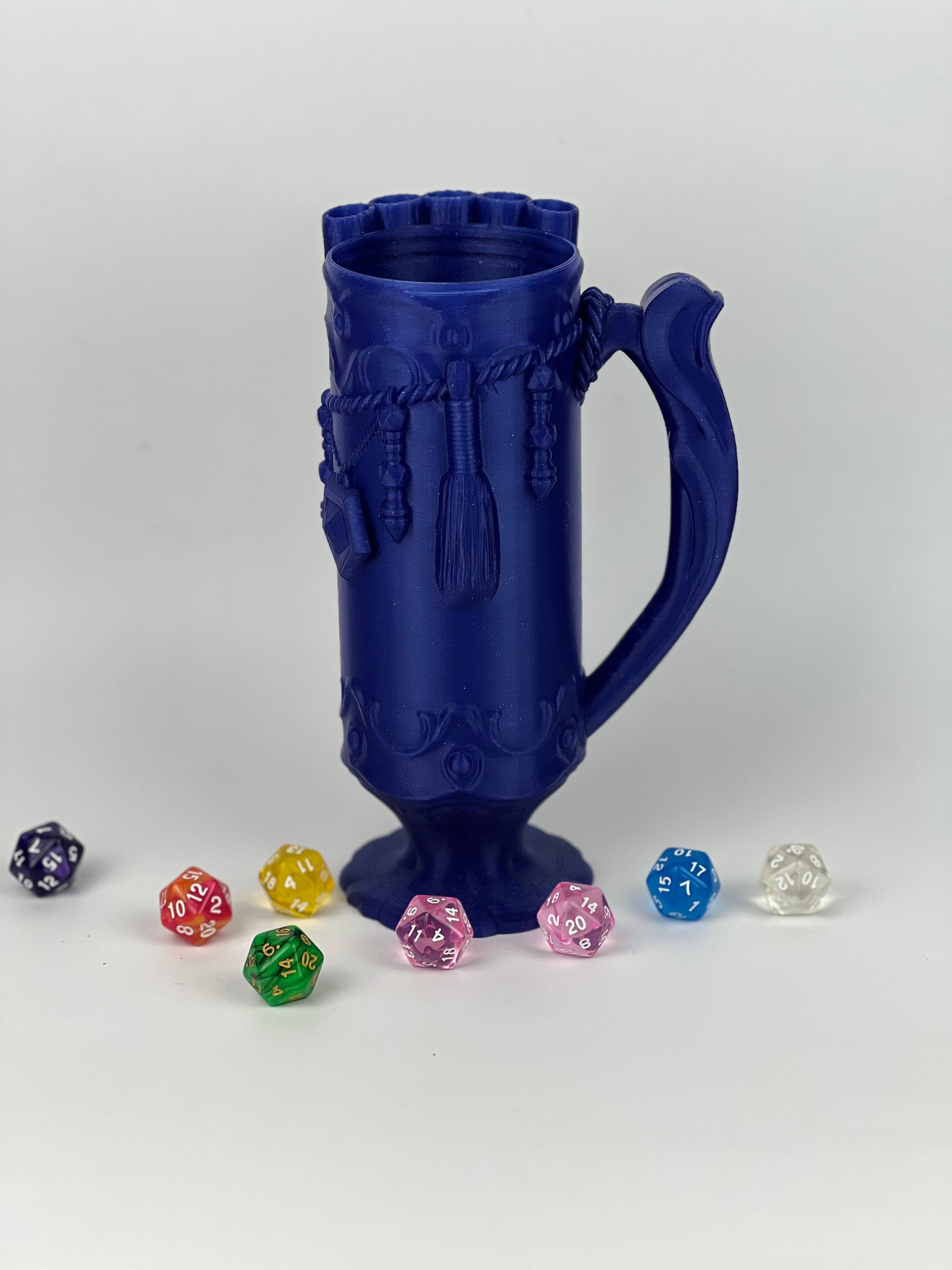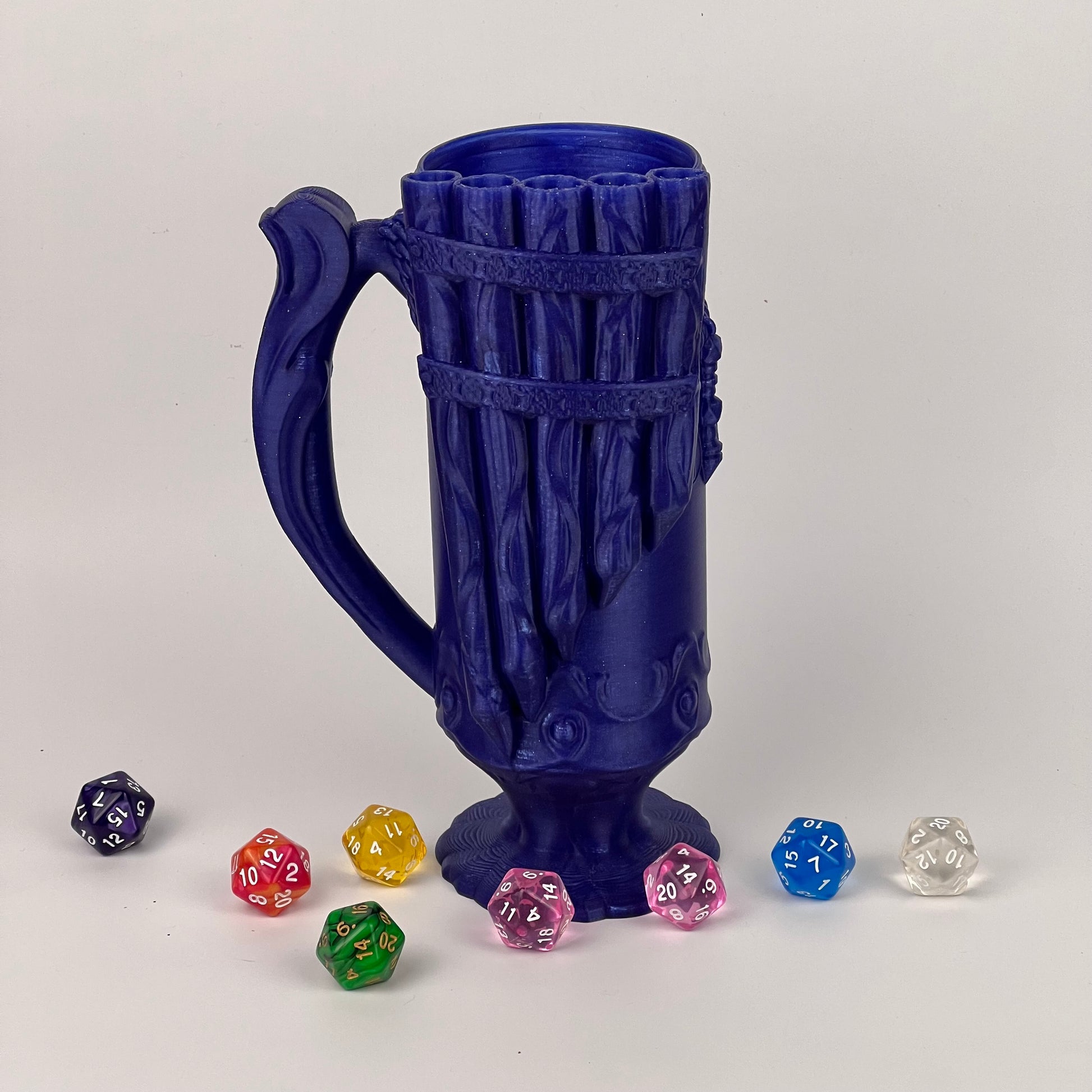 This Mythical Mug also holds the castle dice tower, and is thread for a themed lid or Dice Guardian by Ars Moriendi. It can be used for Cosplay, and to keep you in theme at your local renfaire.
