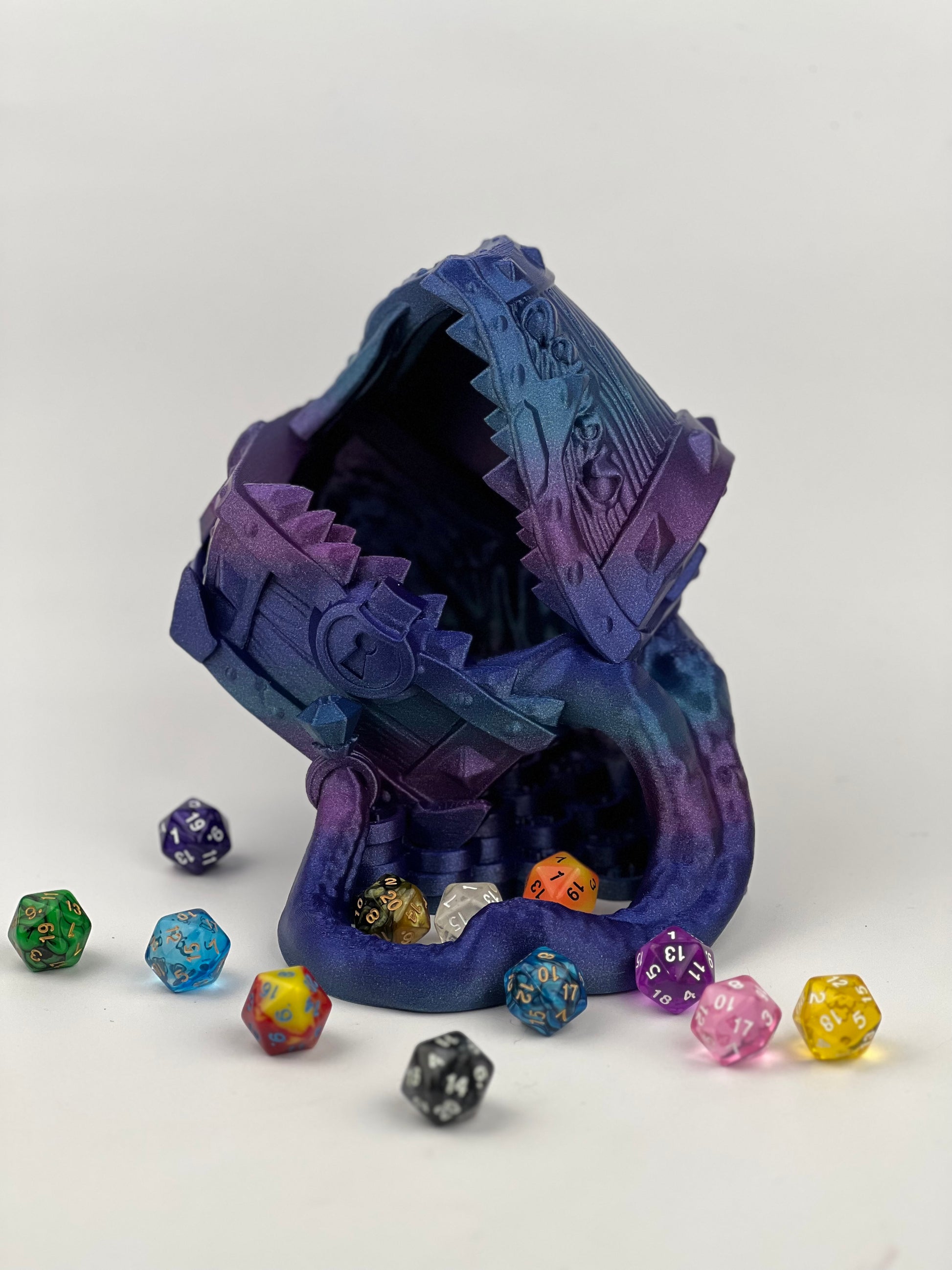 Presenting the Mimic Dice Tower, a deviously charming creation that adds a touch of whimsy and excitement to your gaming experience! This unique dice tower takes the form of a cunning chest sitting atop a bed of shimmering coins, but beware—it's no ordinary chest!