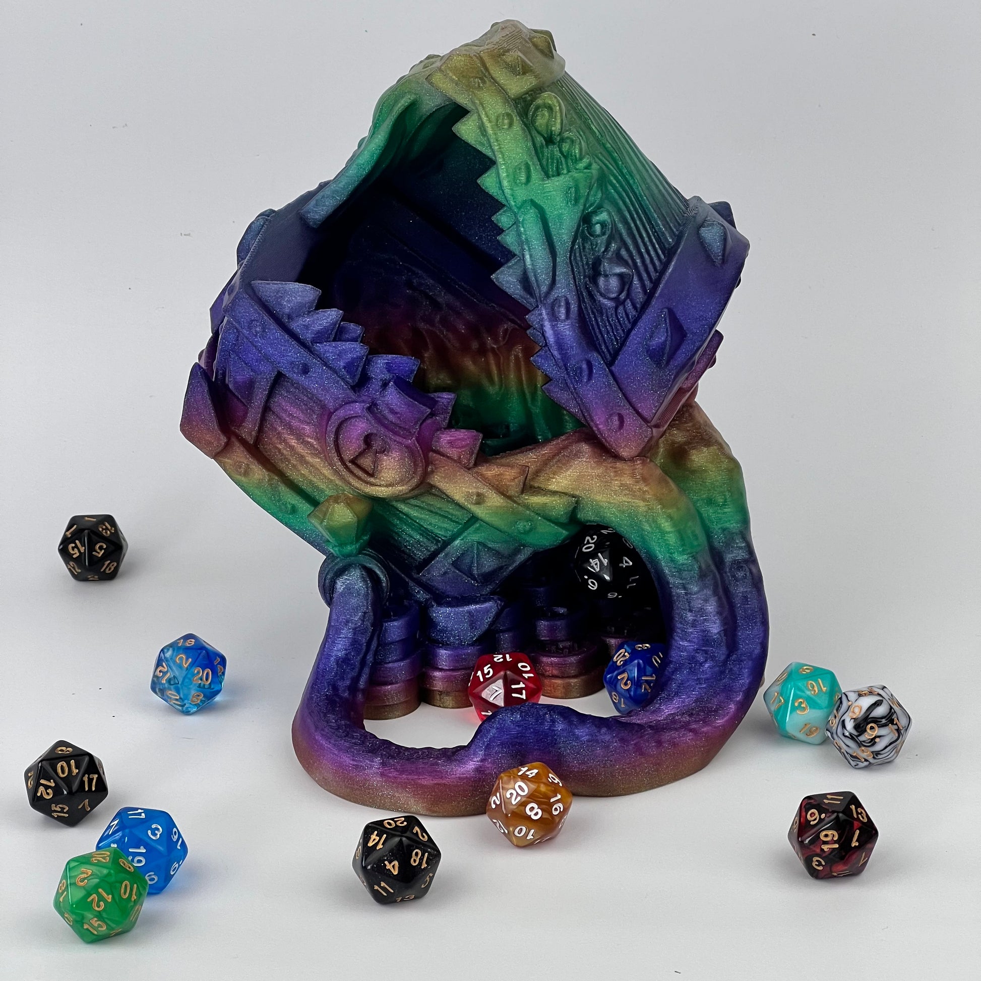 With its clever design, the Mimic Dice Tower not only adds a dash of character to your gaming sessions but also serves as a functional dice-rolling mechanism. Simply drop your dice into the gaping maw of the Mimic, and watch as they tumble and roll down its interior, ensuring fair and randomized results.
