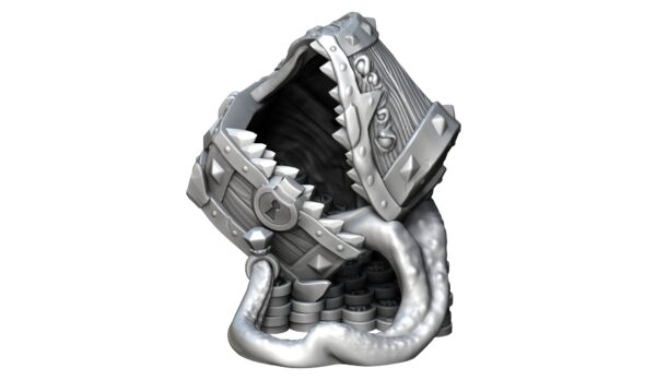 Presenting the Mimic Dice Tower, a deviously charming creation that adds a touch of whimsy and excitement to your gaming experience! This unique dice tower takes the form of a cunning chest sitting atop a bed of shimmering coins, but beware—it's no ordinary chest!