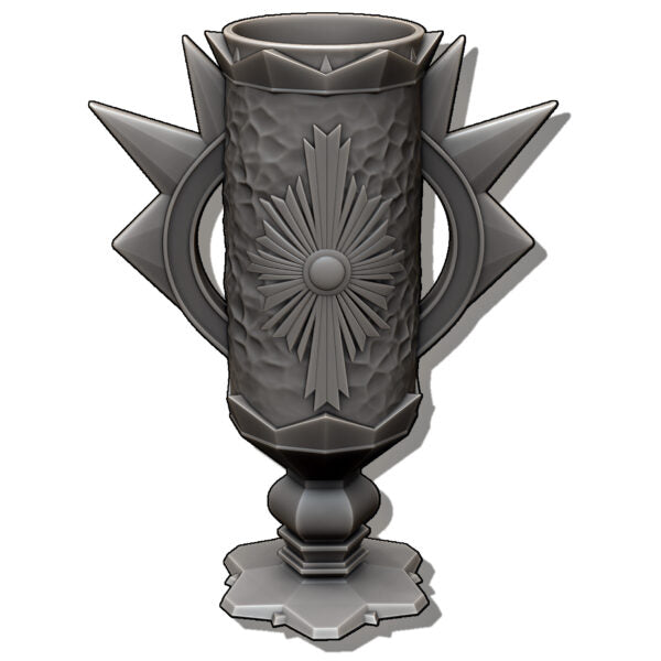A chalice made out of determination, blessed metal and crested with a ray of light. It shows how the Paladin is always ready, to smite the darkness!