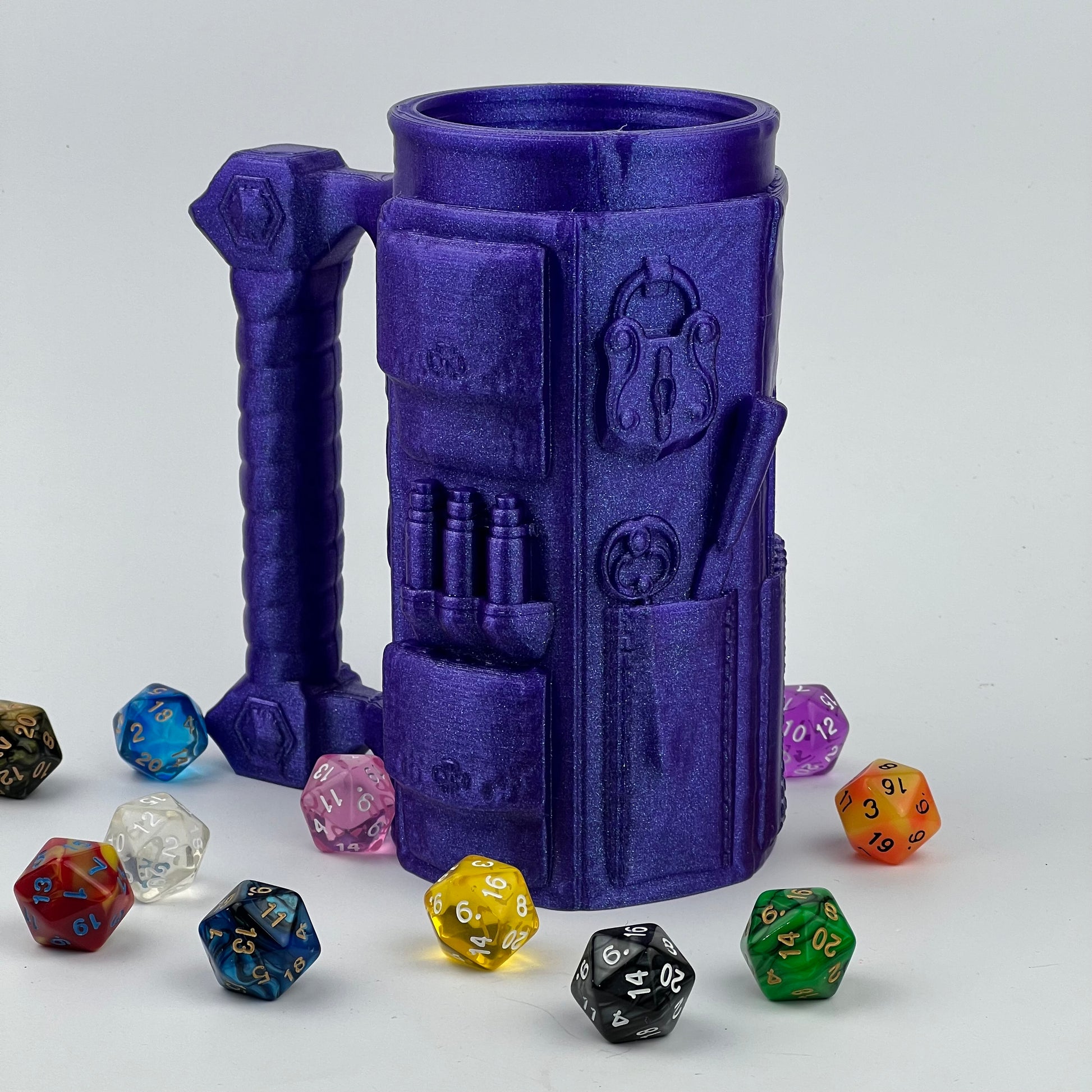 This Mythical Mug also holds the castle dice tower, and is thread for a themed lid or Dice Guardian by Ars Moriendi